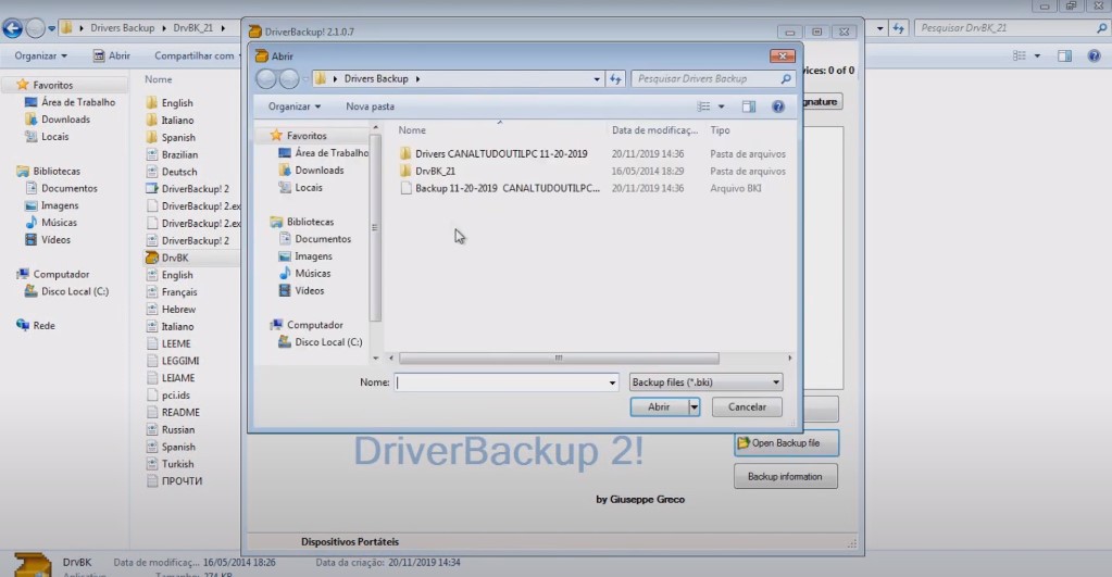 Depois que seu computador for formatado insira o Pen Drive com o backup dos drives e copie a pasta BackupDrives-SeuNome para a área de trabalho do seu computador, de 2 cliques no arquivo DrvBK, a mesma tela irá abrir, porém, desta vez clique em Restore e depois em Open Backup File, busque por um arquivo dentro da sua pasta de Backup, o arquivo tem a extensão .bki
