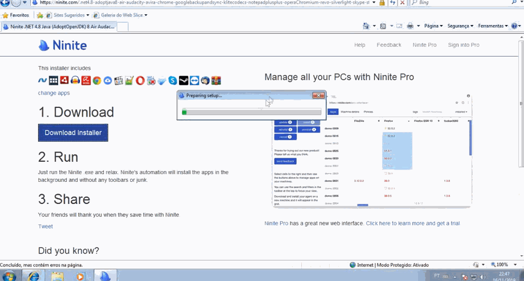 Depois que o download for concluído clique no executável e aguarde a conclusão da instalação, o programa vai baixar e instalar todos os programas que você selecionou no 2º passo, em alguns programas como Steam e Google Drive é necessário configurar usuário e senha, mas é só isso você não precisara fazer mais nada, o ninite se encarregara do download e instalação.